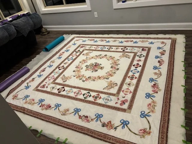 However, bit by bit I am getting there. On February 21, 2025 Lee and I moved our furniture to the side and I sandwiched the quilt on our sunroom floor.