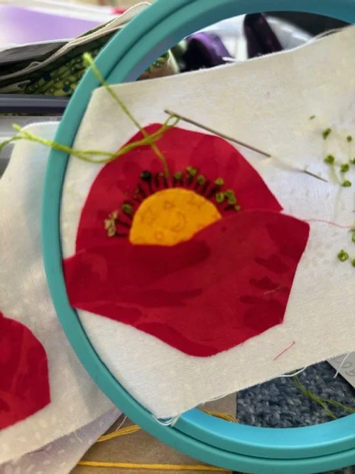 But I must get back to my #1 Poppy. It really needs embroidery added to the middle of the first Poppy and possibly some embroidery on the leaves. I love hand embroidery but have not done it in a long long time. That requires practice! So I simulated the middle of the Poppy on a smaller piece of fabric to practice stitching. Boy, am I rusty! After several of these practice pieces, it looks like I am almost ready to add it to the finished applique. Below is the last practice piece. What do you think?
