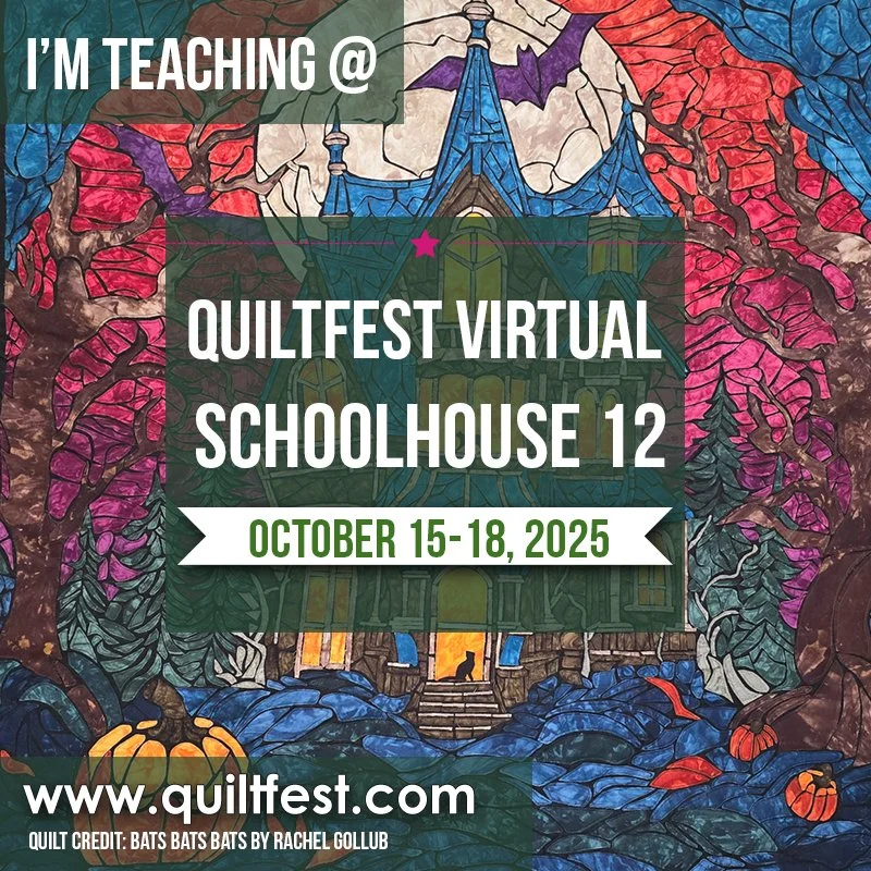 If you missed my Zoom Quiltfest Summer Schoolhouse, you have another opportunity to stitch with me during Quiltfest Virtual Schoolhouse #12, October 15 and 17, 2025. Click the picture below for all the details: