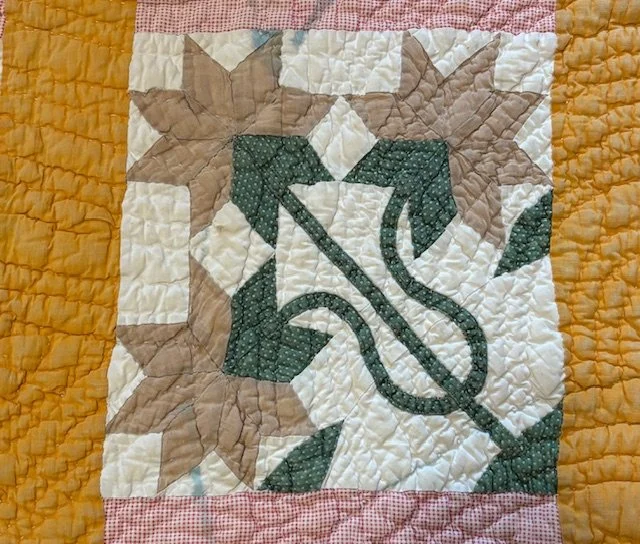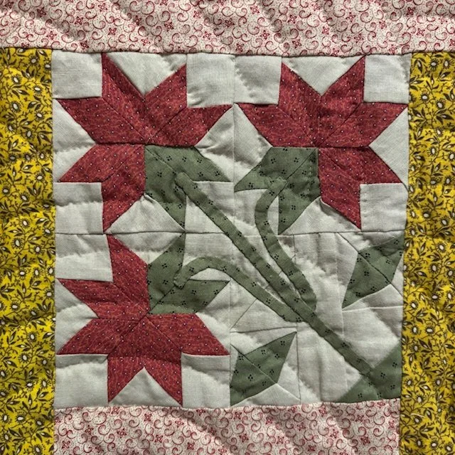 The original 74” x 78” quilt was quilted in a Baptist Fan design which is very common in the Scots-Irish early quilts. I estimate that this quilt dates to early 1900s. The red sashing is a tiny red check. The lilies have turned brown but the original color was a solid red. The other fabrics used are solid cotton.