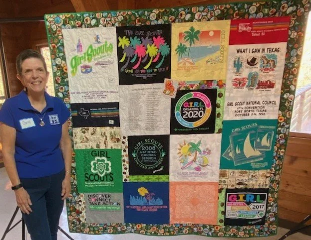 I was very honored that Girl Scouts of the Nation’s Capital asked me to sew all of Joan’s convention t-shirts into a quilt. In November 2022 we hung the quilt at Joan’s Celebration of Life. This quilt is now living in Nation’s Capital Archives.